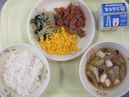 今日のメニュー ○ビビンバ(肉炒め、ナムル、炒り卵) ○牛乳 ○春雨スープ