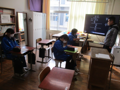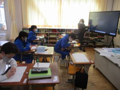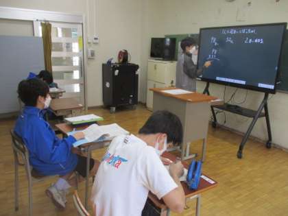 グループ別学習に取り組んでいます。大型ディスプレイ装置を使うと、とても文字が見やすいです。