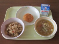 今日の給食は「米飯」「牛乳」「厚焼きたまご」「野菜の炒め物」「鶏肉と生揚げのうま煮」です。「うま煮」とは鶏肉や豚肉、牛肉などを油でいため、しょうゆ、砂糖、みりんなどで甘辛く味付けして煮つけた肉料理のことを指します。今日の給食もおいしくいただきましょう。