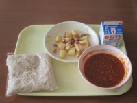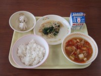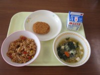 今日の給食は「米飯」「牛乳」「カレーライス」「海藻サラダ」「いちごのムース」です。金曜日はカレーの日、安心します。今日の給食もおいしくいただきましょう。