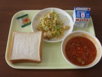 今日の給食は「米飯」「牛乳」「星型ハンバーグ照り焼き」「ごま和え」「七夕のすまし汁」です。今日は、七夕です。七夕にちなんだ、星型ハンバーグとすまし汁です。今日の給食もおいしくいただきましょう。皆さんの「願い」が叶いますように。