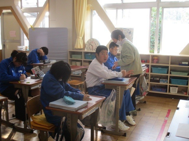1A英語では、私の周りにいる素敵な人という単元で、これまでに教科書で登場してきた人物を、3人称単数を使って、簡単な英語で紹介する学習をしました。ペアでやりとりする場面では、積極的に表現する姿がよかったです。