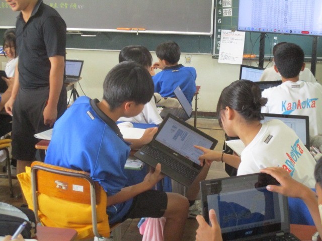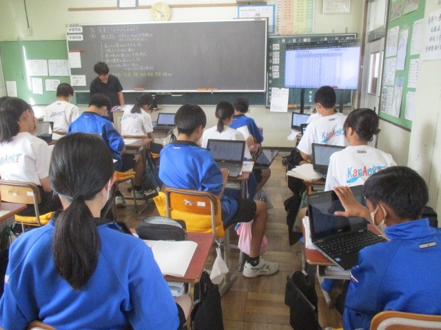 1A国語は、竹取物語、歴史的仮名遣いについて考える場面でした。並んで先生に考えを持って行く中にも、仲間との教え合いが生まれていました。