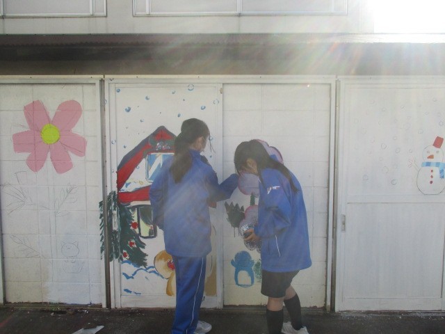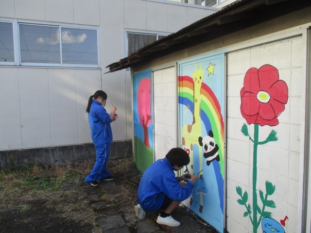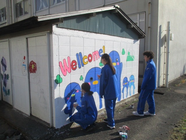美術部の皆さんに西門横の旧部室(現在は倉庫)の壁に壁画を描いてもらっています。正面のペンギンは、生徒会のスローガンからきています。西の道路側を向いて生徒のみなさんや来校者を出迎えます。ドアの部分は、入学から四季の絵画が描かれています。下絵から色が入り始めて、とてもきれいです。完全な仕上がりは年度末になるでしょうか。完成を楽しみにしています。