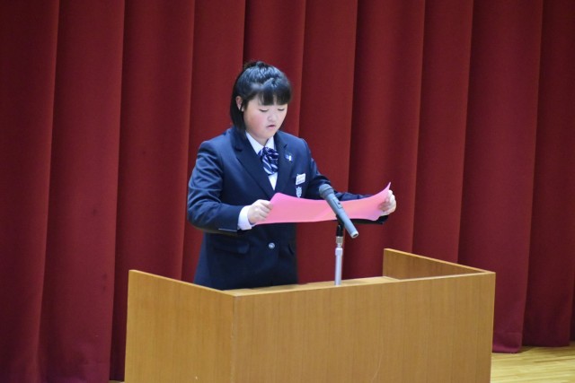 12月23日(火)2学期の終業式が行われました。G組と1年代表生徒による、「2学期を振り返って」のスピーチです。自分の学校生活の振り返りとともに、これからの抱負も語ってくれました。