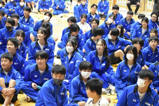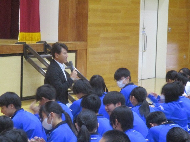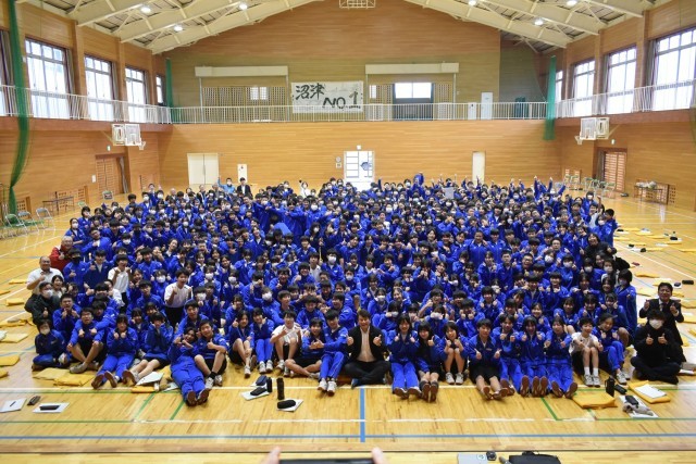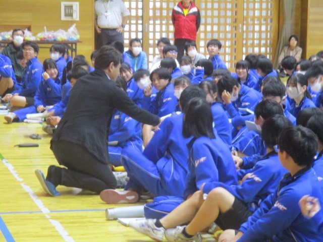 「ピンチはチャンス」玉入れの玉を使ってのアクティビティーでは、先生方も加わり、4人組からクラスの人数に増やし、チャレンジしました。失敗を恐れない、失敗をチャンスと捉える、その積み重ねでみんなの気持ちが一つになっていく。今年も、生徒はもちろん先生方にとっても、動きがあって、学ぶことの多い、印象に残る夢講演となりました。最後に恒例の全員での記念写真を撮りました。この講演会は、金岡奨学会の事業活動によるものです。講師の畑喜美夫先生はもとより、関係者の皆様、ありがとうございました。