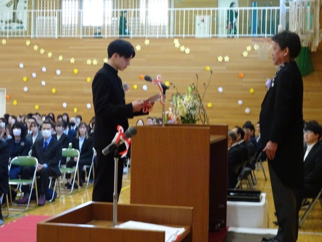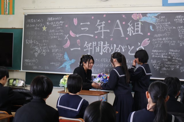 教室に戻り、一人一人に卒業証書授与が行われ、先生から、生徒からの贈り物がそれぞれ披露されました。思いのこもった、いい卒業式でした。ご来賓の皆様、保護者の皆様、来校ありがとうございました。