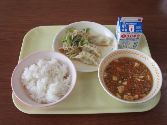 今日の給食は「米飯」「牛乳」「麻婆豆腐(マーボードウフ)」「焼きぎょうざ」「もやしと小松菜のナムル」です。麻婆豆腐は、正式には「陳麻婆豆腐」と呼ばれ、清の時代に四川省成都の陳富文の妻が作ったことに由来します。今日の給食もおいしくいただきましょう。