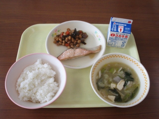 今日の給食は「米飯」「牛乳」「塩鮭」「五目煮豆」「やさしい味噌汁」です。秋鮭(あきざけ)は9月から11月に欠けて北海道や東北地方で漁獲される鮭です。産卵前のため身が引き締まりあっさりとした味わいが特徴です。今日の給食もおいしくいただきましょう。