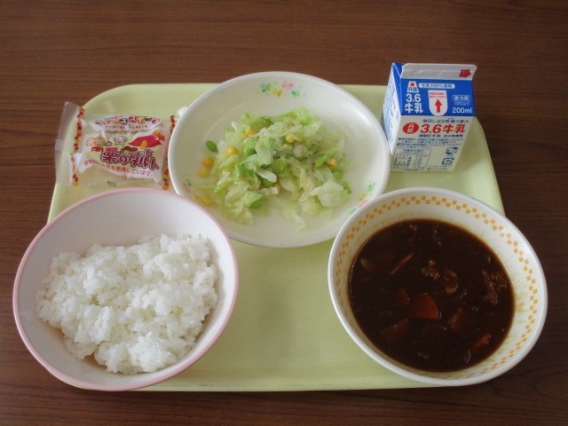 今日の給食は「米飯」「牛乳」「枝豆とキャベツのサラダ」「さつまいもと栗のタルト」です。ハヤシライスは、薄切り牛肉とタマネギをデミグラスソースで似たものを米飯の上にかけた料理です。給食では豚肉ですがよい味です。今日の給食もおいしくいただきましょう。