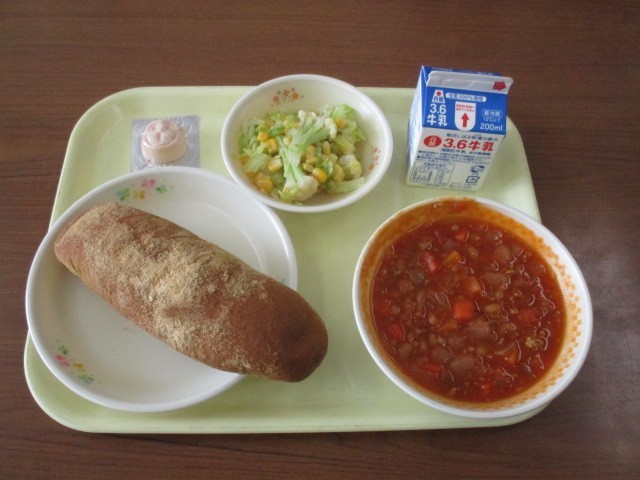今日の給食は「お茶きなこ揚げパン」「牛乳」「チリコンカン」「カリフローレサラダ」「型抜きチーズ」です。チリコンカンとは、メキシコ料理が由来のアメリカ南部テキサス州の郷土料理で、肉、豆、玉ねぎ、トマト、スパイスを煮込んだ料理です。今日の給食もおいしくいただきましょう。