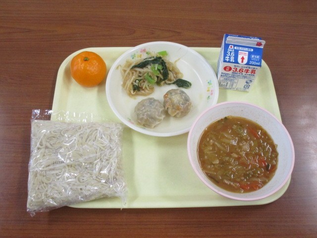 今日の給食は、「中華麺」「牛乳」「みそラーメン」「にらまんじゅう」「ナムル」「西浦みかん」です。今日の寒い時期に食べたいラーメンといえば、やはりもそラーメンですね。今日の給食もおいしくいただきましょう。