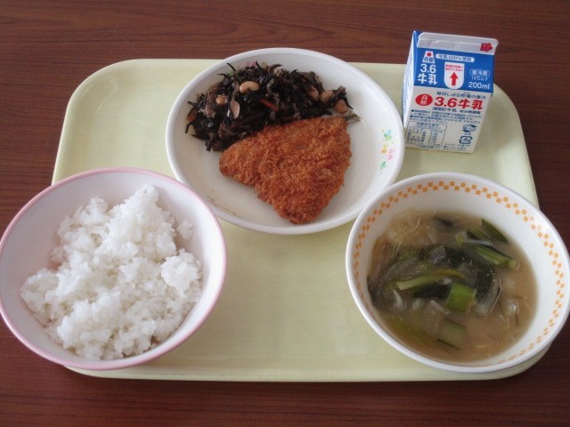 今日の給食は「米飯」「牛乳」「あじフライ」「ひじきの炒め煮」「玉ねぎとジャガ芋のみそ汁」、アジのEPAとDHA、ひじきのカルシウムなど、栄養満点の食材の和定食です。今日の給食もおいしくいただきましょう。