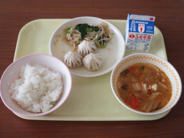 今日の給食は「米飯」「牛乳」「ポーク包子(パオズ)」「ナムル」「豚キムチスープ」です。包子(パオズ)とは、中国の伝統的な点心の一種で、小麦粉の生地を蒸して作られ、中に具を包んだものです。日本では「中華まん」として知られています。今日の給食もおいしくいただきましょう。