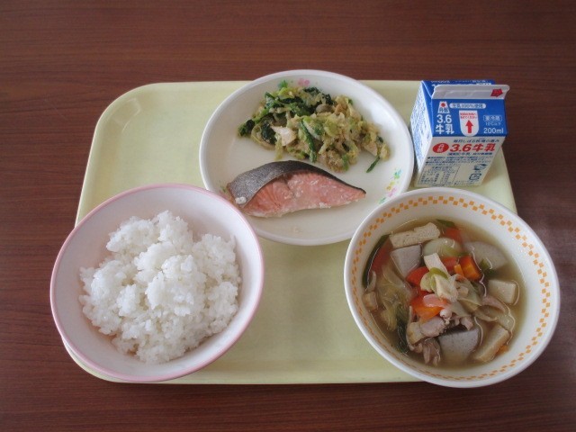今日の給食は「米飯」「牛乳」「焼き塩鮭」「ごま和え」「すいとん」です塩鮭の旬は、秋から冬にかけての時期です。今日の給食は和食です。おいしくいただきましょう。