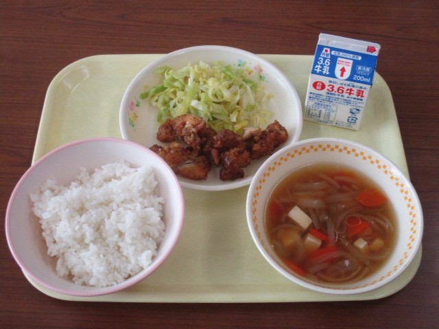 今日の給食は「米飯」「牛乳」「鶏肉のから揚げコロコロレモン」「キャベツのソテー」「中華スープ」です。鶏肉にレモンをかけると酸味でさっぱりとして食べやすくなり、鶏肉の栄養素を効果的に摂取できるメリットがあります。今日の給食もおいしくいただきましょう。