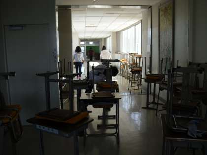 2年部の教員は、新学級の座席を整えています。旧学級から運び出され、廊下に置かれていた机いすを、新学級の教室へ運び込みました。