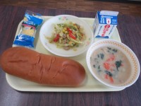 今日の給食は「黒糖入りロールパン」「牛乳」「豆乳のクリームシチュー」「ウインナー...
