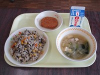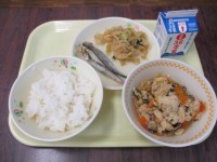 今日の給食は「米飯」「牛乳」「たまご炒り豆腐」「焼きししゃも」「キャベツと小松菜...