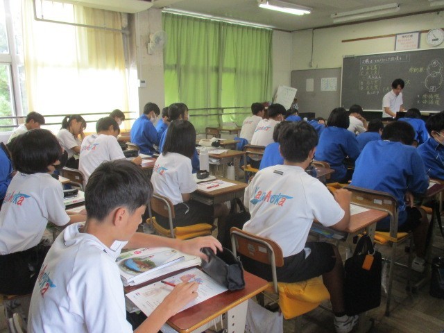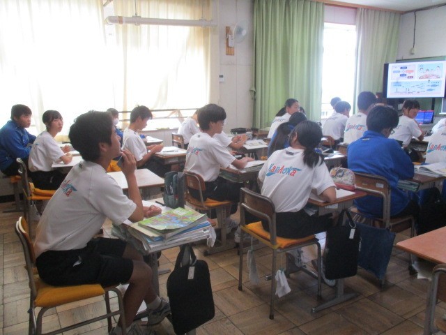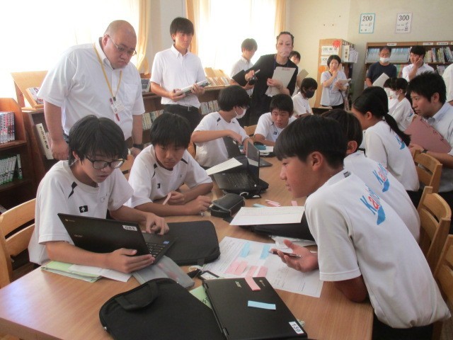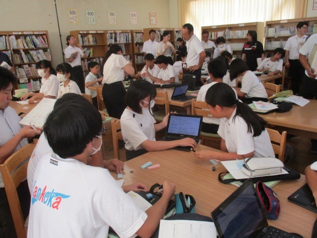 かなりの暑さで、気温の上昇がさらに見込まれることや、生徒と参観の先生で、大人数が一同に集まることもあって、急遽、図書室を授業会場としました。自分の実践を踏まえ、アドバイスを行う中で、栄養面や調理に関すること、食材や経済面まで、より多くの視点から「なりたい自分になるための献立」を考え、食生活について考えることができました。