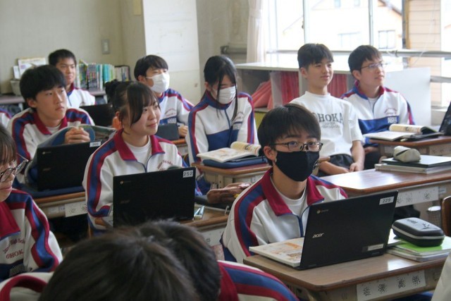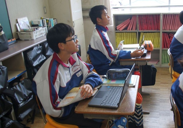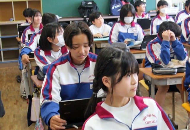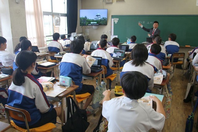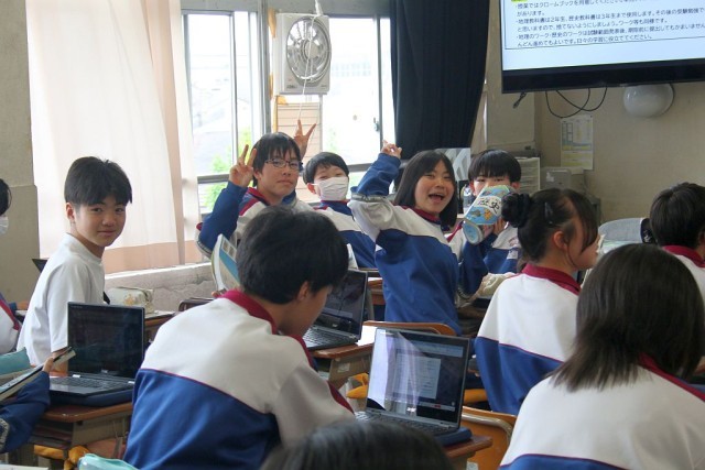 2年生の社会では、ガイダンスの後、戦国時代からの映像を見ながら、「近世の日本」について学習を進めていました。時折、笑い声が起こるなど、とてもいい雰囲気で授業が進められていました。