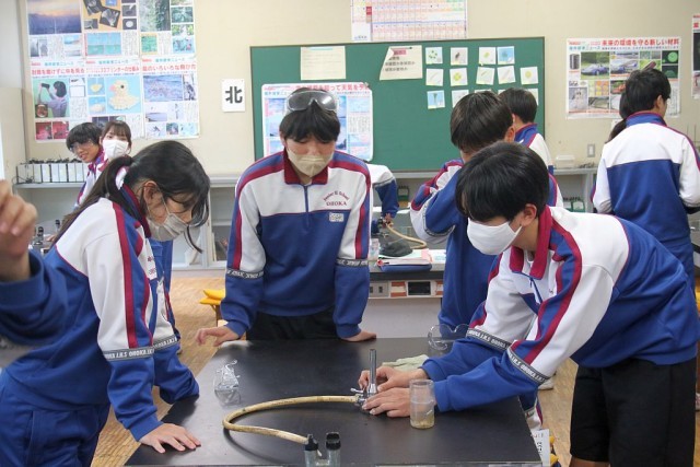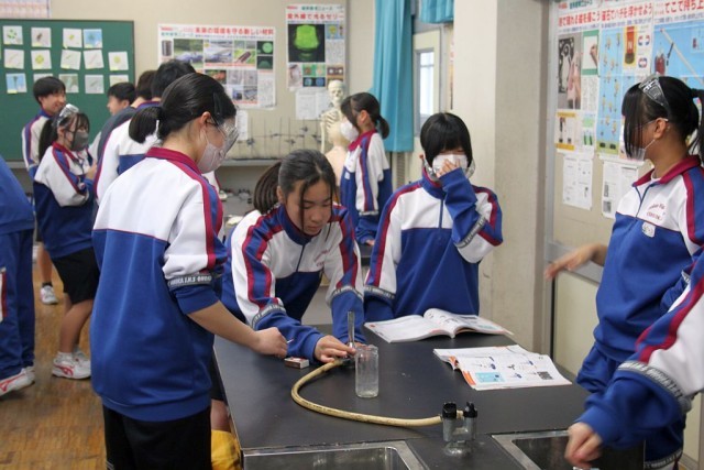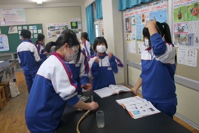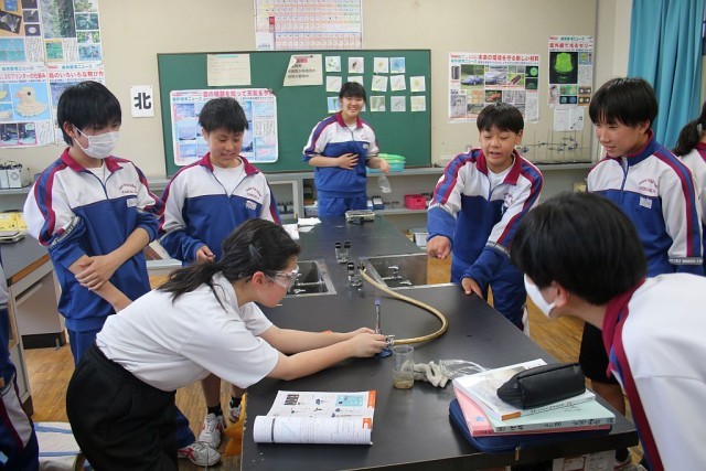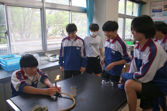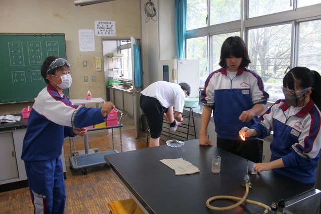 2年生の理科では、「班で協力して、カルメ焼きをつくろう」を学習問題として授業が進められています。まずはガスバーナーの安全な使い方を学びます。普段マッチを使うことがない生徒たちは、火をつけるまでに一苦労…。でもあきらめずに何回もチャレンジしていました。