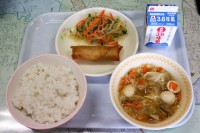 今日の給食は、「たけのこご飯」「黒はんぺんフライ」「ミルク入り豚汁」「アーモンドフィッシュ」「牛乳」です。たけのこご飯は、たけのこがシャキシャキで味付けもよく、大変美味しかったです。豚汁は、具材が軟らかく、ミルク入りでコクがあり、黒はんぺんフライは、衣がサクサクでとても美味しかったです。