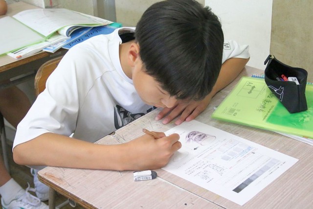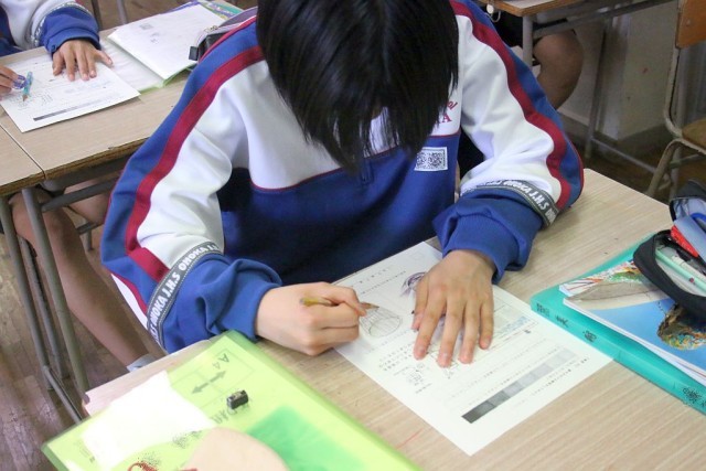 1年生の美術では、「コップのデッサン」を行っています。コップの見る角度や影のでき方、透視法を活用した作図などを学んでから、デッサンに入りました。デッサン時はみんな集中しているので、教室が静まり返っていました。