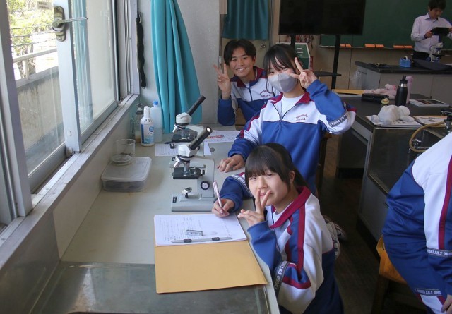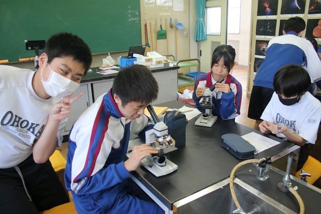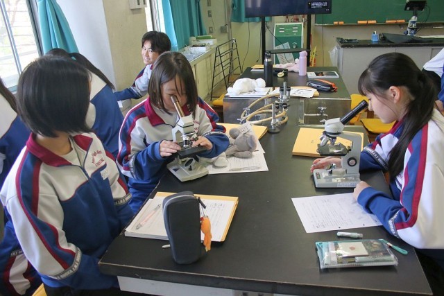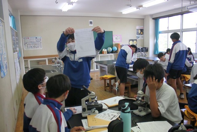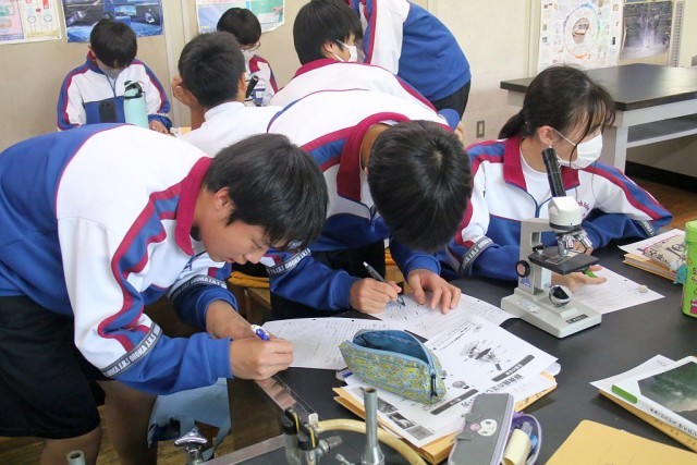 3年生の理科では、「分裂ってどのように行われているの?~無性生殖編~」を学習問題として授業が進められています。ソラマメの根を使って、成長している細胞の中はどのような状態になっているのかを調べています。みんな顕微鏡を何回ものぞきながら、プリントへ丁寧にまとめていました。