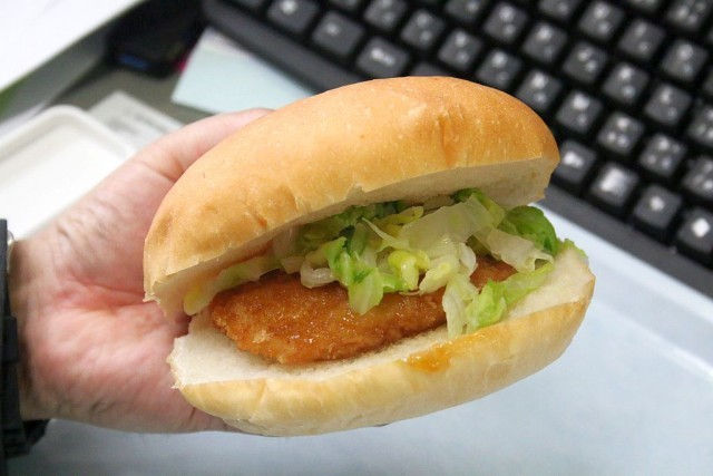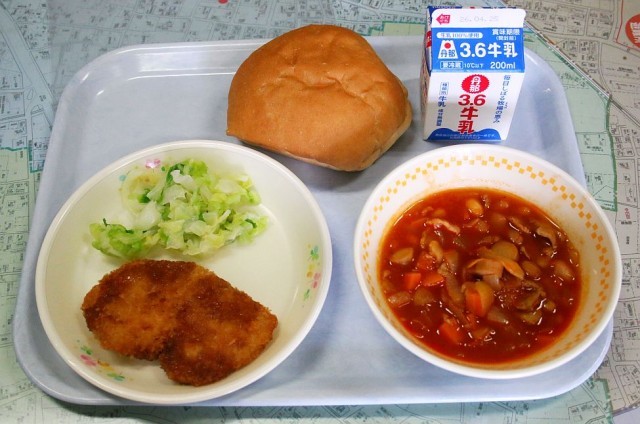 今日の給食は、「丸横割りパン」「チキンカツ照り焼きソースがけ」「ボイルドキャベツ」「ポークビーンズ」「牛乳」です。チキンカツとキャベツをパンにはさんで食べました(写真は村瀬先生のチキンカツバーガーです)。ポークビーンズは、豆が軟らかく、トマトや豚肉のエキス、ワインが利いた味付けがとても美味しかったです。