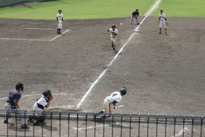 7月14日(土)雨のため1日延期された野球大会の本校と大岡中の対戦が市営球場で行われました。先攻の本校は、1回表に2点を先制、1回裏に2点を失いましたが、2回表にさらに2点を追加するなど、ゲーム中盤まで優位に試合を進めました。しかし、後半に惜しくも得点を失い、5対8で敗れました。手に汗握る好ゲームが展開され、本校生徒の爽やかさと健闘する姿はとても感動的でした。なお、大岡中は15日(日)の第2試合で、第三中学校を3対0でやぶり、来週の準決勝に進むことになりました。
