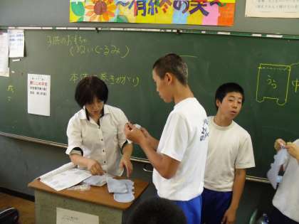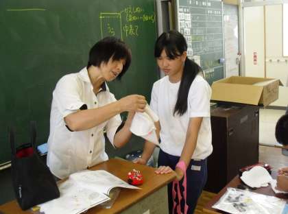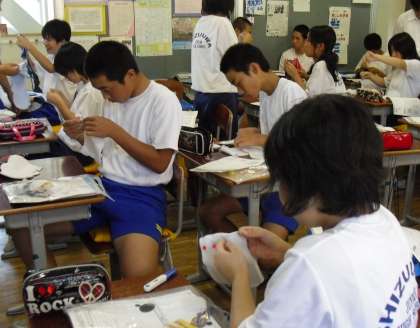 3年生は、家庭科で裁縫(動物のぬいぐるみ作り)を行っています。縫い方で分からないところは、先生や友達に聞いて作品を作っています。