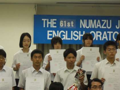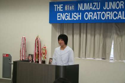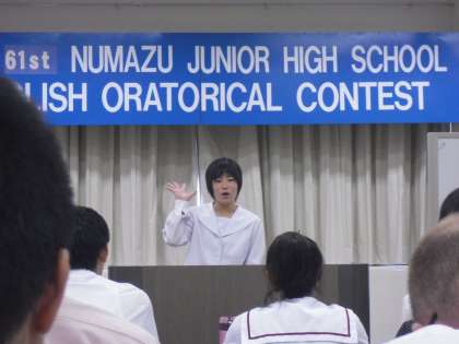 昨日、沼津市英語弁論大会が沼津教育会館で行われました。市内の公私立中学校から23名の生徒が出場しました。大会は、暗唱の部(7名)と自作の部(16名)に分かれて行われました。自作の部に3年の小林さんが、将来の夢を流暢な英語で発表してくれました。