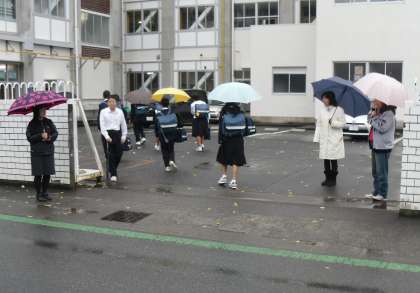 生徒の皆さんは、あいさつ運動に参加してくださっている保護者に元気よくあいさつして登校しましょう。