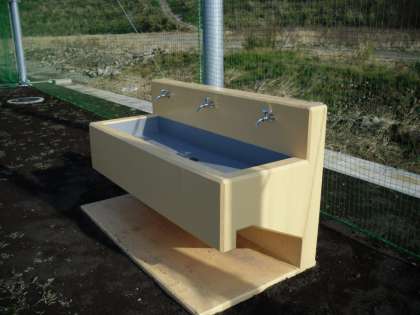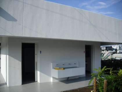 散水設備はグランドに3つ、テニスコートに1つあります。トイレは体育器具庫棟にあります。水道は野球のバックネット裏とテニスコートにあります。