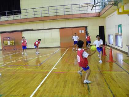 本日の第5時、教育実習生が1Bの体育で研究授業を行いました。ハンドボールの試合に臨むために、チームで現状から目標を立て、それに向けて練習をしました。練習後、男女に分かれて試合をしました。