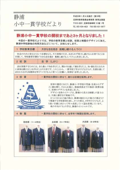 本日、静浦小中一貫学校だより第19号を配布しました。また、配布文書のコーナーにもPDFファイルを掲載しましたので、御覧いただけます。
