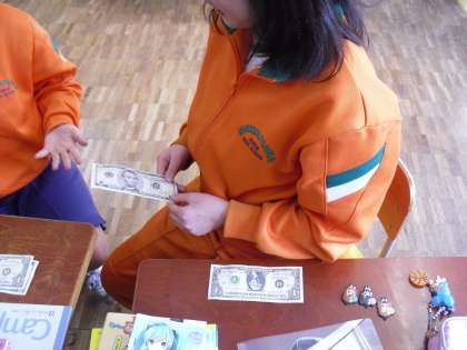 C組は英語の授業において、買い物で使用する英語を使って会話を楽しみました。実際にアメリカドルを使用し、「How much?」「5dollars」などと話して買い物をしました。