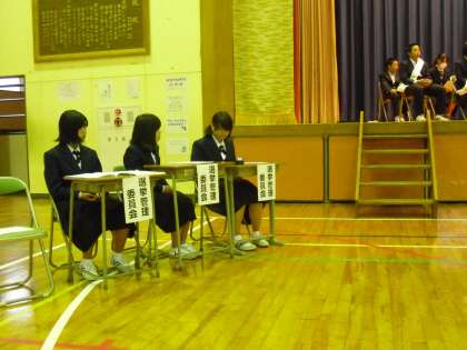 本日の第6時に平成26年度自治会役員選挙が行われました。最初に立会演説会をして、5人の立候補者がスローガン、公約などを堂々と話しました。演説会終了後に各クラスで投票が行われました。