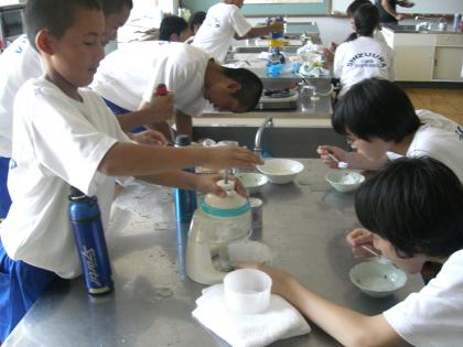 2年A組は、調理室でかき氷作りをしました。何人かの生徒が自宅からかき氷作り機を持参して活動しました。一人一人楽しく活動することができました。