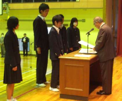 朝礼に先立ち、各種で活躍した生徒の表彰が行われました。