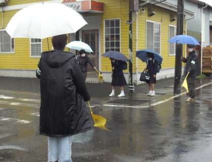 月曜日の7:15〜7:45まで、正門と学校西側の中道の交差点の2カ所で行われます。今年度のあいさつ運動は、あと1回(3月12日)のみとなりました。