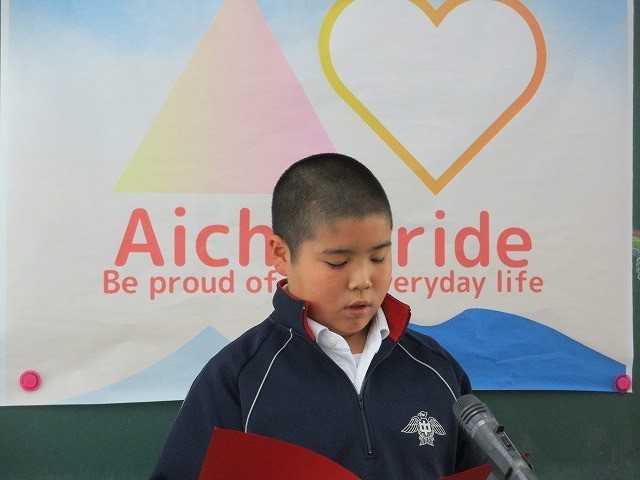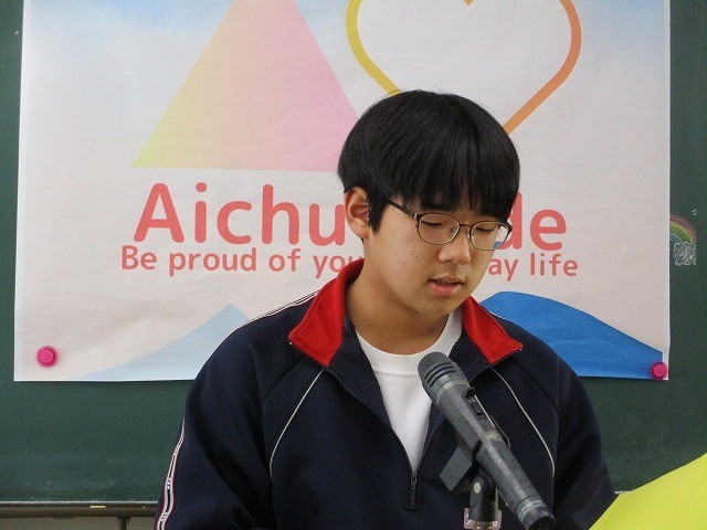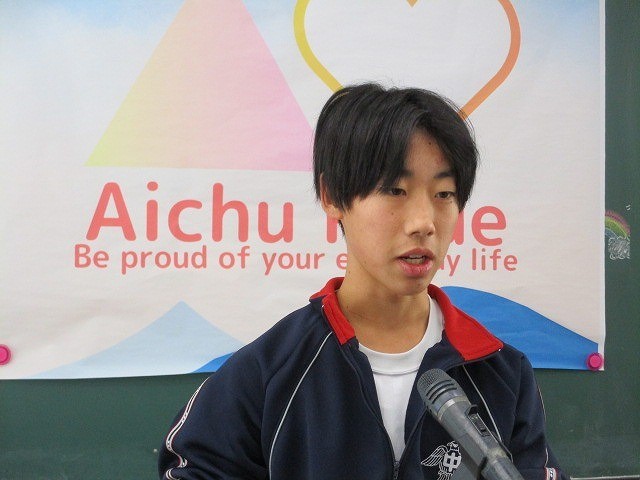 寒さ対策のため、2学期終業式をリモートで行いました。各学年の代表生徒は、自分たちの成長したところや3学期に頑張りたいことを力強く発表しました。