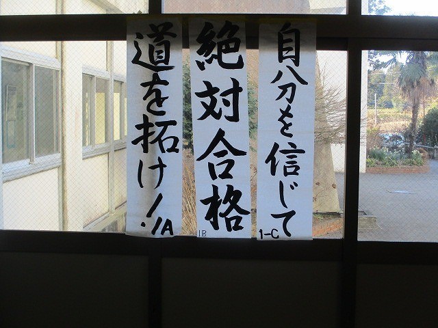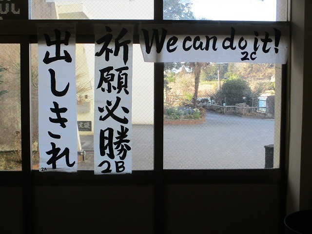 明日から始まる私立高校入試に向けて、3年生昇降口に1,2年生からの応援メッセージが掲示されています。みんなで応援しています。