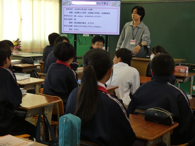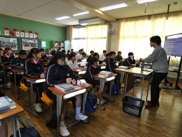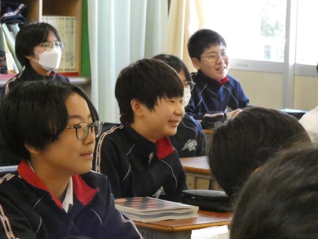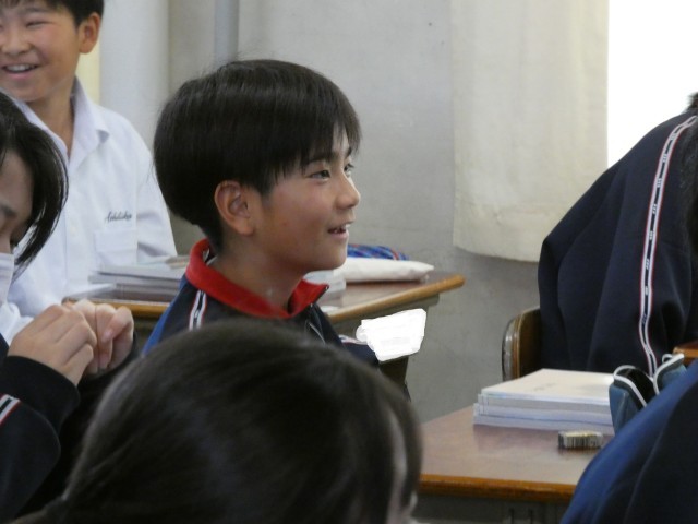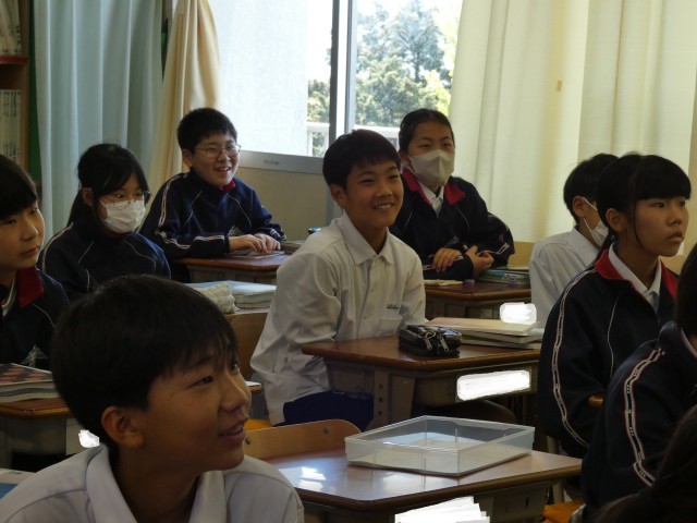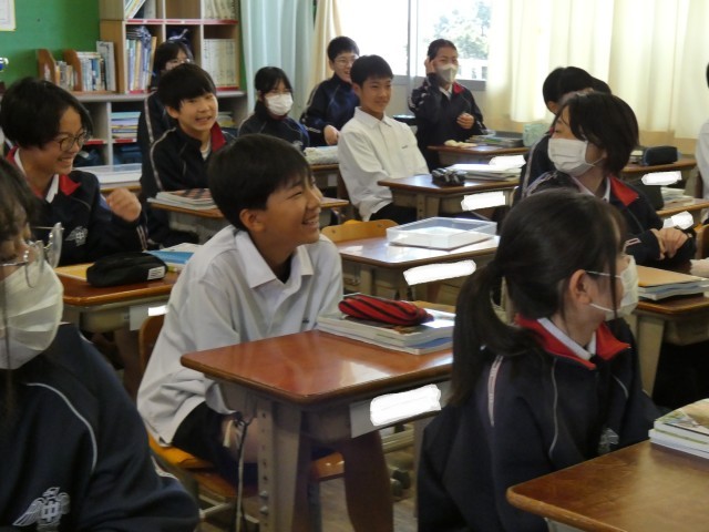 1年A組の社会の授業です。ガイダンスを行っていました。中学校の社会の授業が楽しみなる笑顔があふれていました。