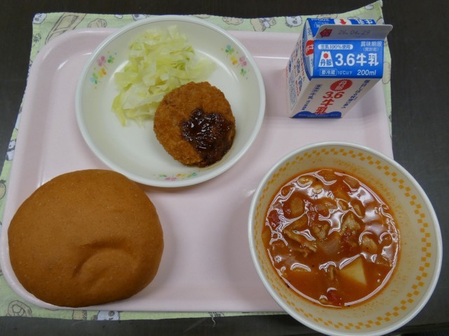4/21(火) 今日の給食 公開日 2026/04/21 更新日 2026/04/21 今日の給食 今日のメニューは・メンチカツ・ラビオリ入りトマトスープ・ボイルドキャベツ・丸形パン・牛乳です。 いいね(0)