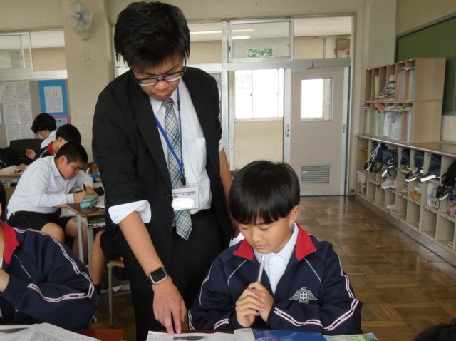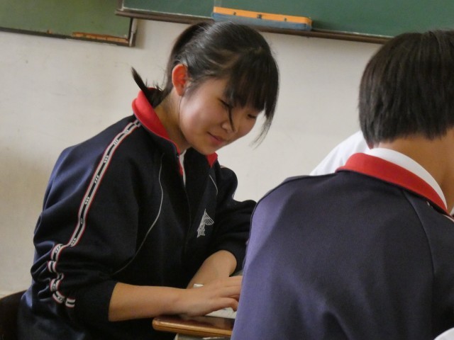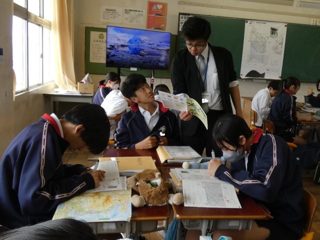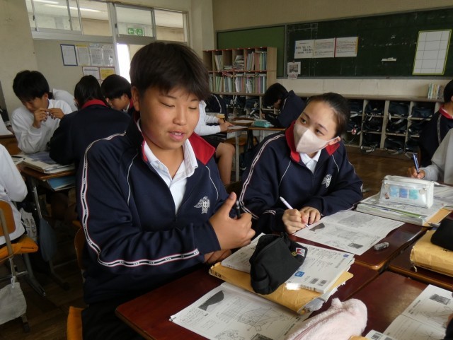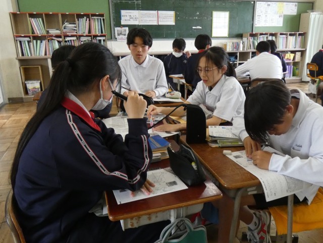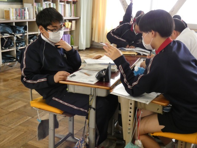 2年A組の社会の授業の様子です。今日は等高線の学習です。等高線から地図上の地形はどんな特徴があるのか読み取っています。