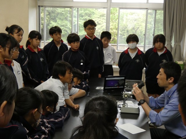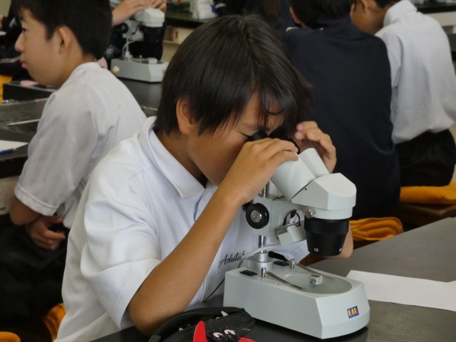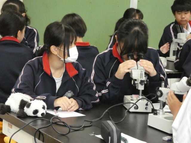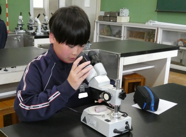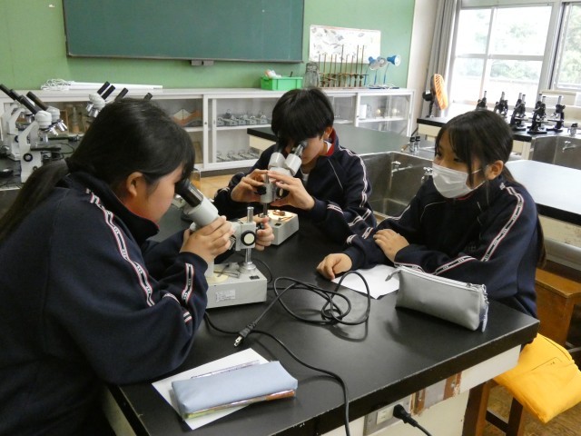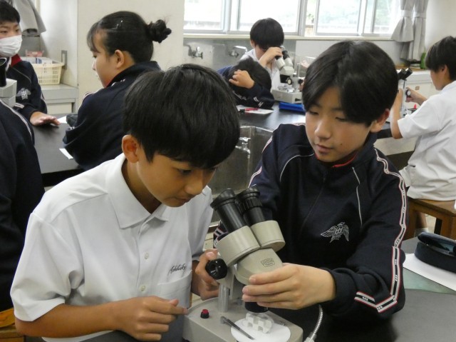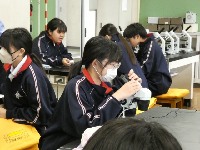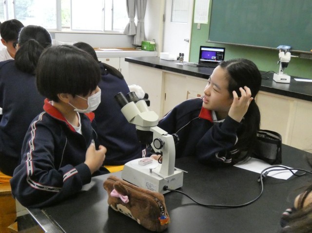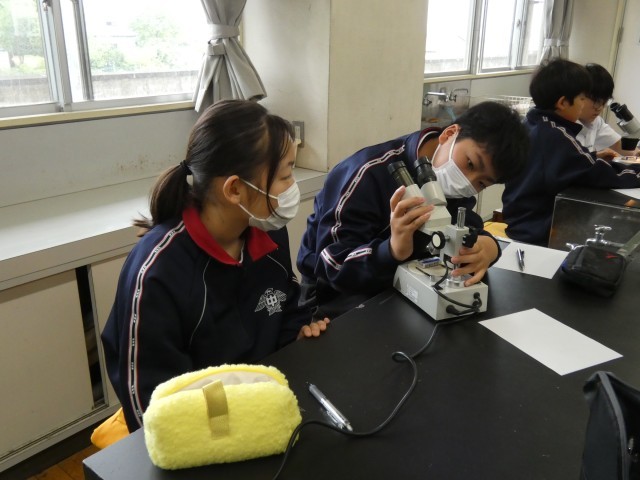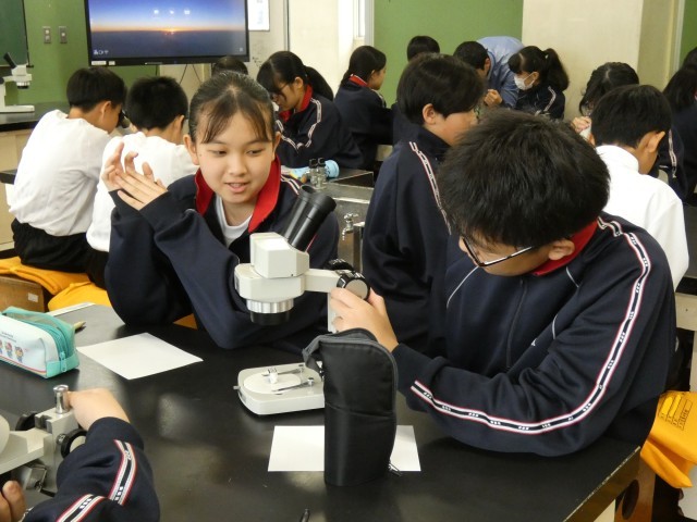 1年C組の理科の授業の様子です。双眼実体顕微鏡の使い方を学んでいます。
