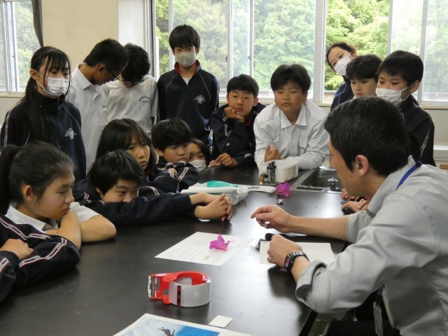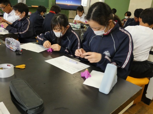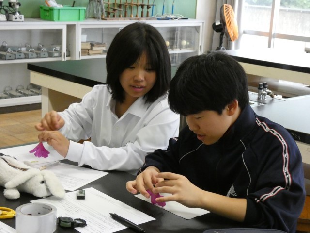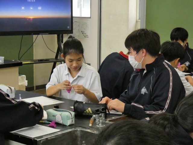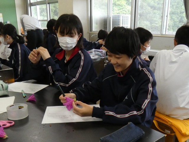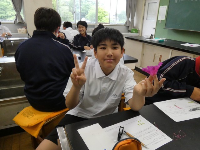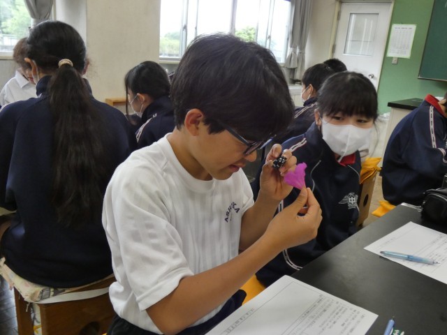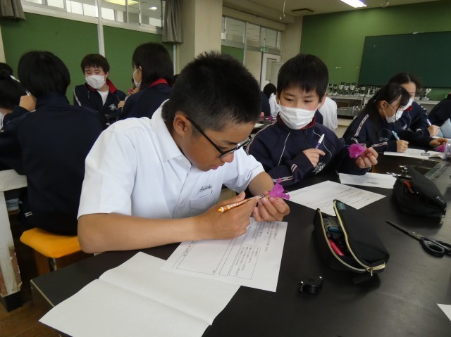 1年B組の理科の授業の様子です。花のつくりを調べています。