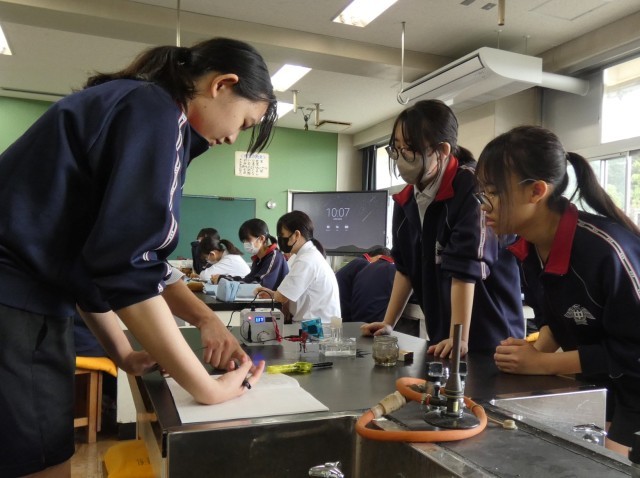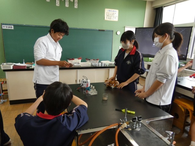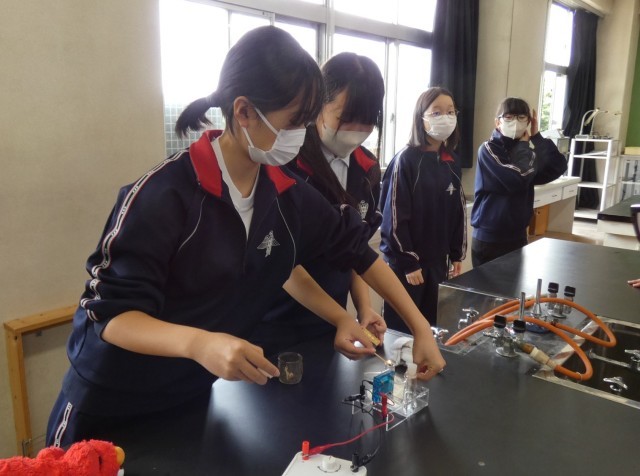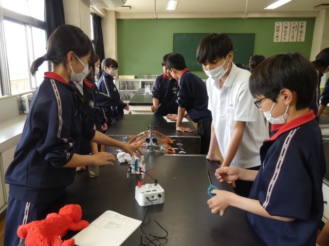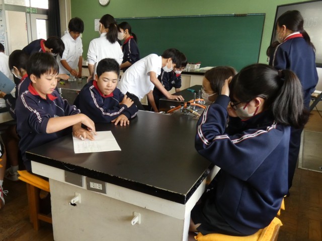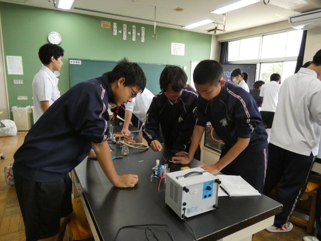 2年C組の理科の授業の様子です。「水を電気で分解できるか」という問いを実験で確かめています。
